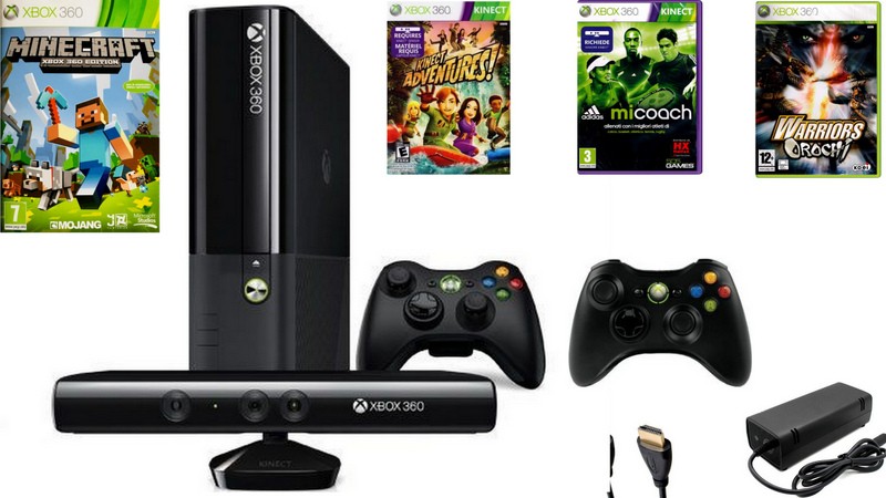 Konsola Xbox 360 E 500GB w komplecie z sensorem ruchu, dwoma  bezprzewodowymi padami oraz trzema grami.