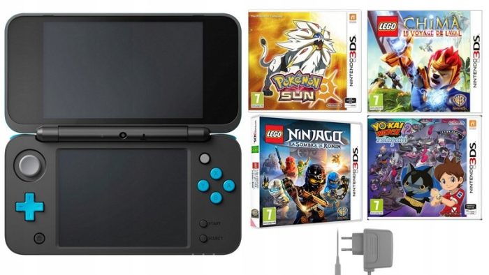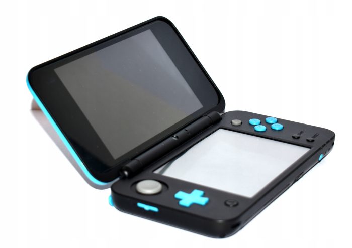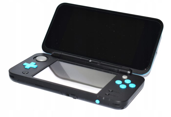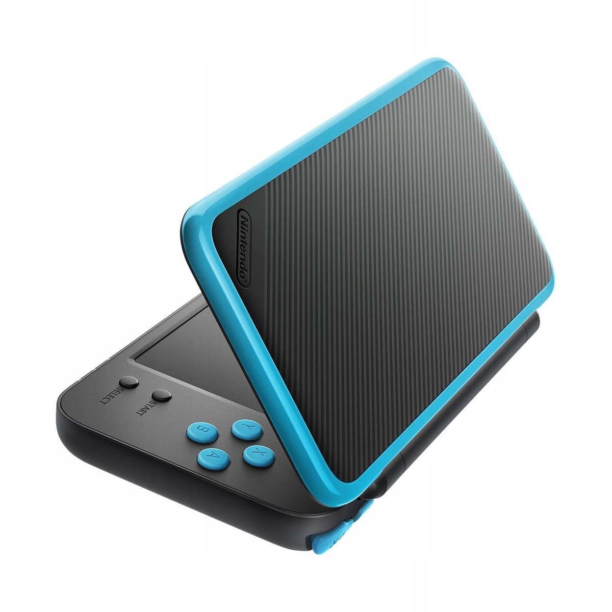 Konsola New Nintendo 2DS XL w komplecie z czterema grami oraz ładowarką sieciową.