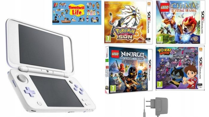 Konsola New Nintendo 2DS XL Tomodachi Edition w komplecie z czterema grami oraz ładowarką sieciową.