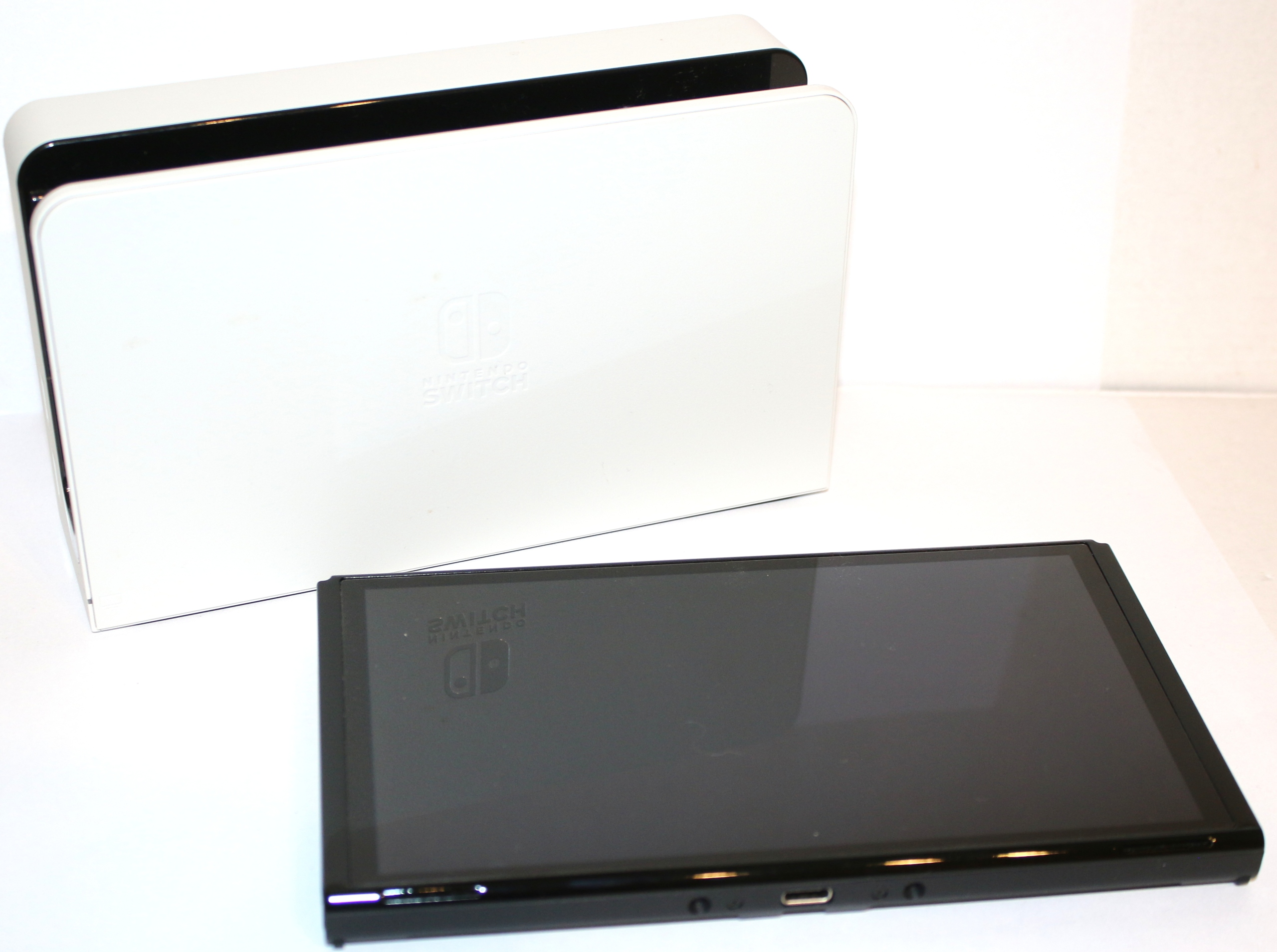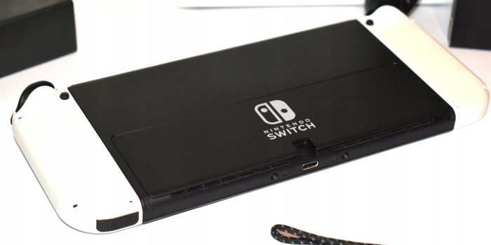Stacja dokująca w Nintendo Switch OLED model zawiera dwa porty USB, port HDMI do podłączenia do telewizora, a teraz także port do podłączenia kabla sieciowego dla stabilniejszego połączenia podczas gry online w trybie TV.