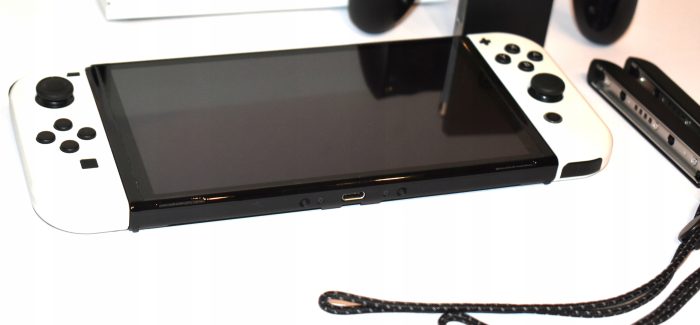 Stacja dokująca w Nintendo Switch OLED model zawiera dwa porty USB, port HDMI do podłączenia do telewizora, a teraz także port do podłączenia kabla sieciowego dla stabilniejszego połączenia podczas gry online w trybie TV.