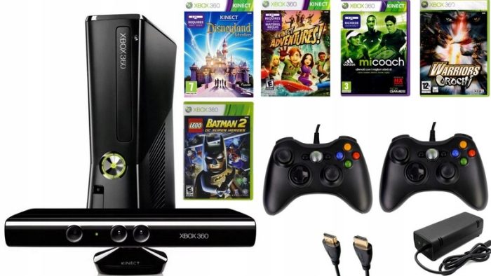 Konsola Xbox 360 S 250GB w komplecie z sensorem ruchu, dwoma nowymi przewodowymi padami oraz pięcioma grami.